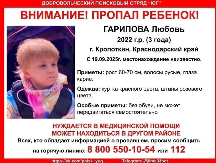 Ориентировка о пропаже трехлетней Любочки появилась в tg-канале добровольческого поискового отряда вечером 20 сентября. В ней сообщалось, что в Кавказском районе пропала девочка 2022 года рождения. Ее местонахождение неизвестно с пятницы, 19 числа.