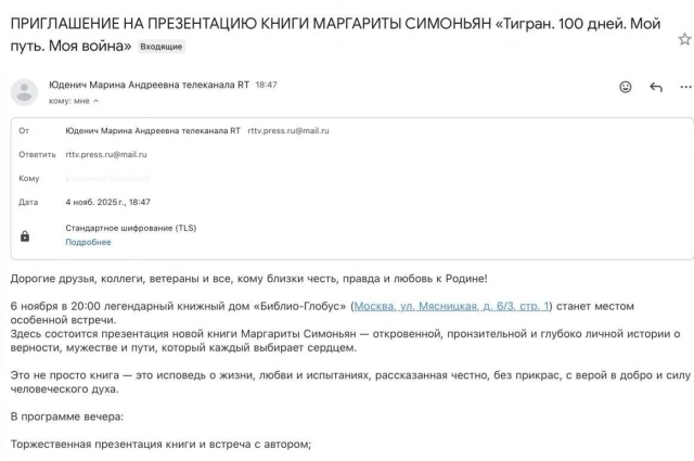 «Хозлы рассылают приглашения на презентацию якобы моей книги о Тигране. Это, конечно же, фейк. Правоохранительные органы уже занимаются. Будьте бдительны», — написала журналистка.