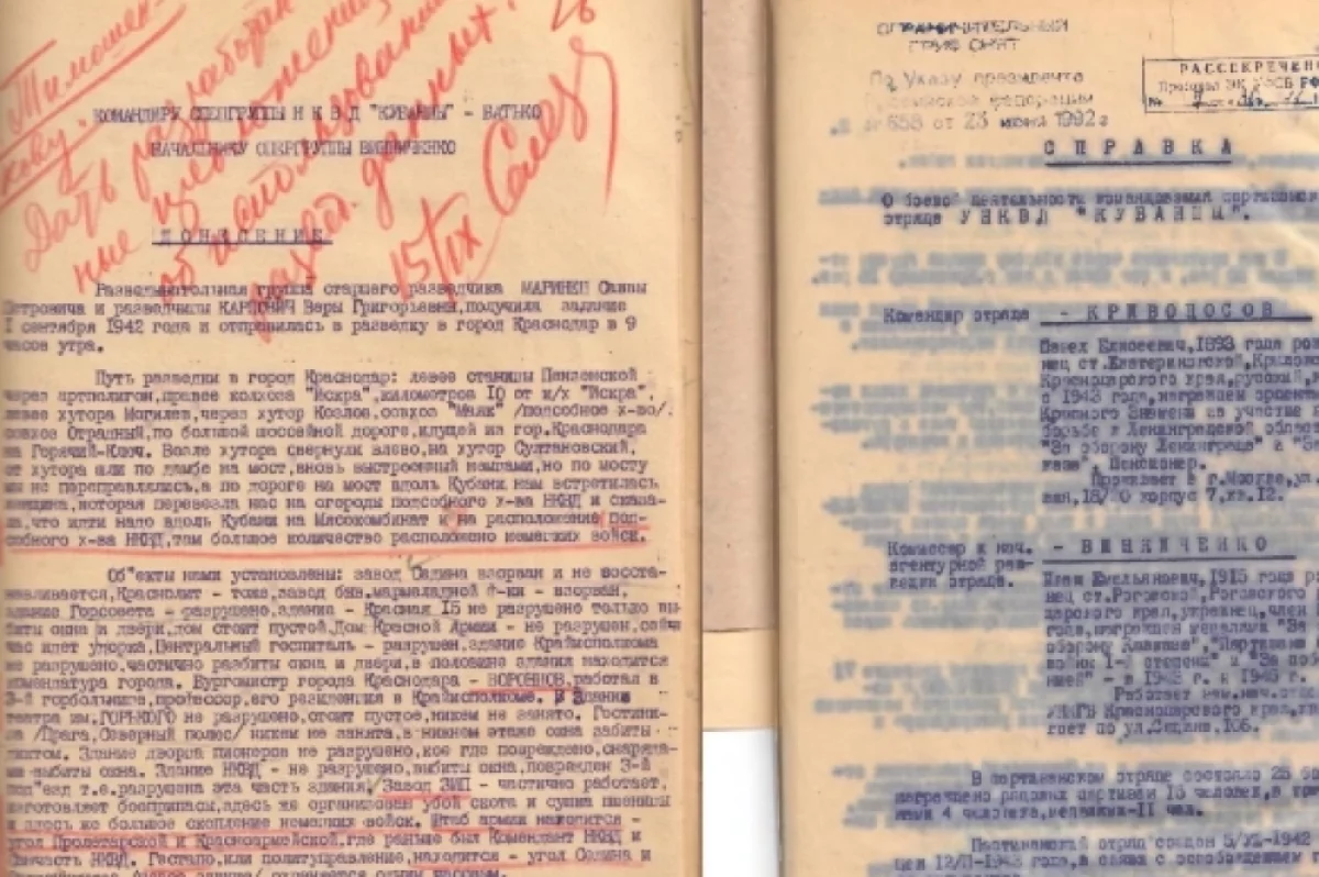 Дислоцировалась группа при фронтовой полосе в хуторе Шевченко Горяче-Ключевского района. За полгода агенты совершили более 50-ти вылазок в расположение войск противника, только в оккупированный Краснодар они проникали 16 раз. Мы собрали обрывки из отчетов, чтобы описать то, что происходило тогда в кубанской столице и ее окрестностях. Далее — выдержки из документов, которые хранились под грифом «Совершенно секретно».