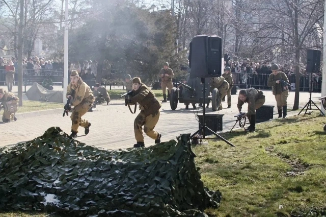 В реконструкции приняли участие порядка 60 членов военно-исторических клубов. Они показали финальный бой за Краснодар. Также в сквере работала выставка оружия и ретро-техники.