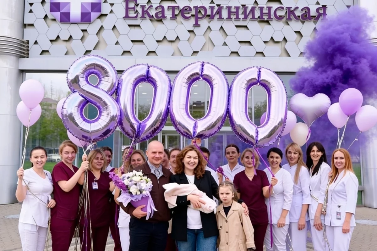 В честь рождения «юбилейного» 8000-го малыша семье традиционно подготовили памятные подарки и праздничную выписку — особенный момент, подчеркивающий атмосферу события.