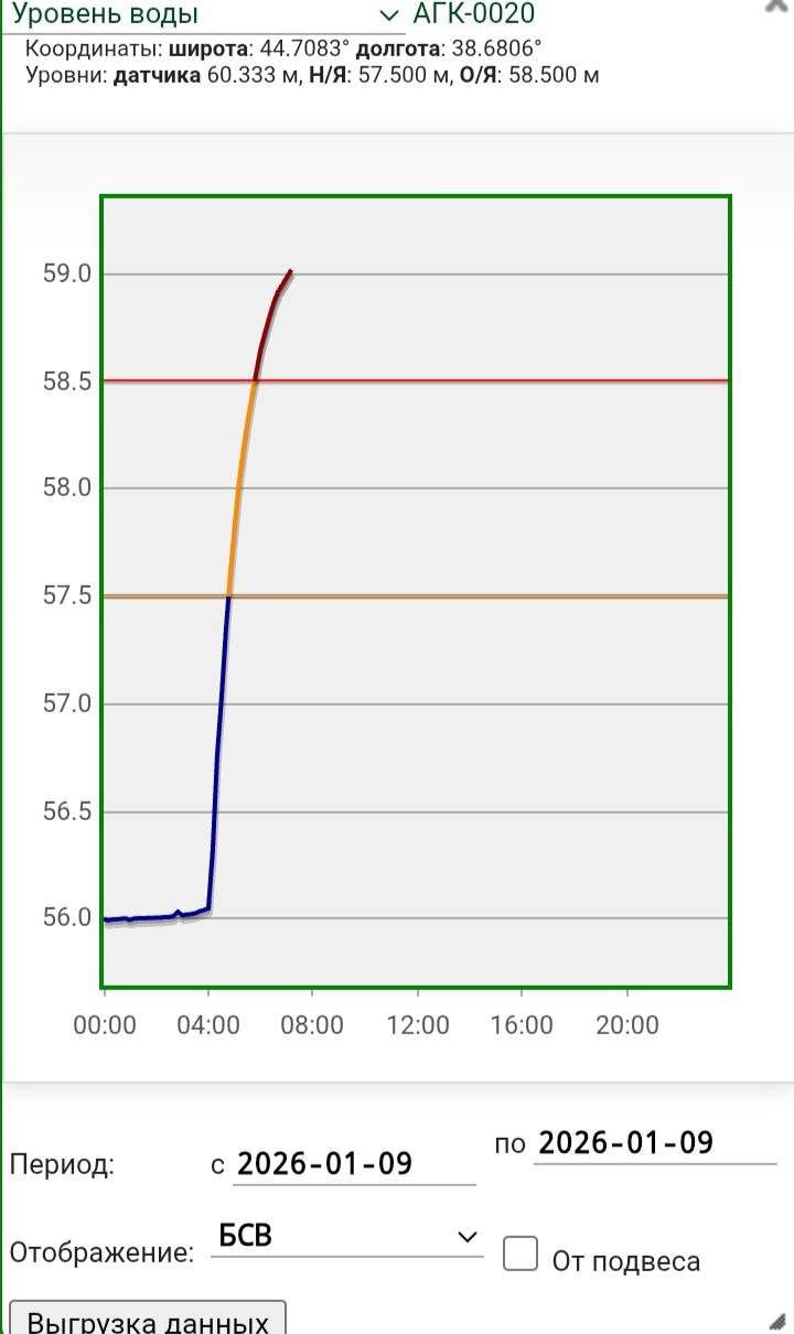Отметку «Опасное явление» зафиксировал датчик на реке Афипс в станице Крепостной, «Неблагоприятное явление» — на реке Убин в станице Азовской.