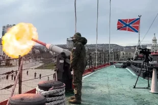С борта корабля боевой славы Военно-морского флота крейсера-музея «Михаил Кутузов» произведен традиционный залп.